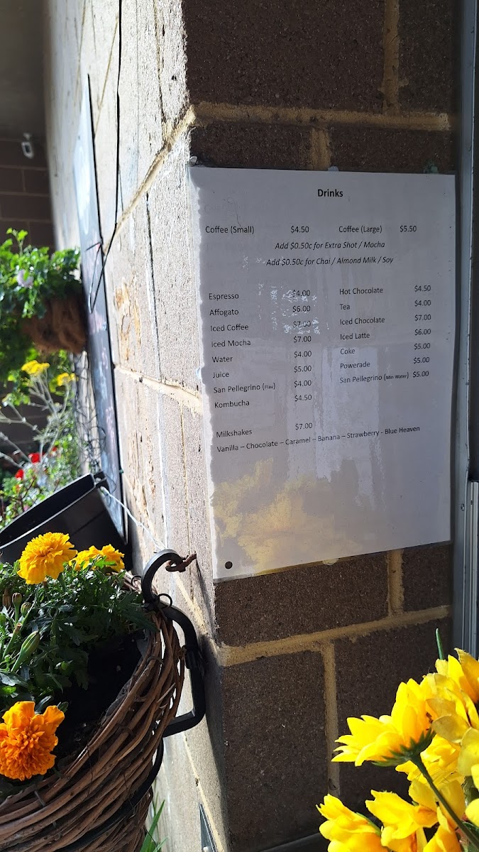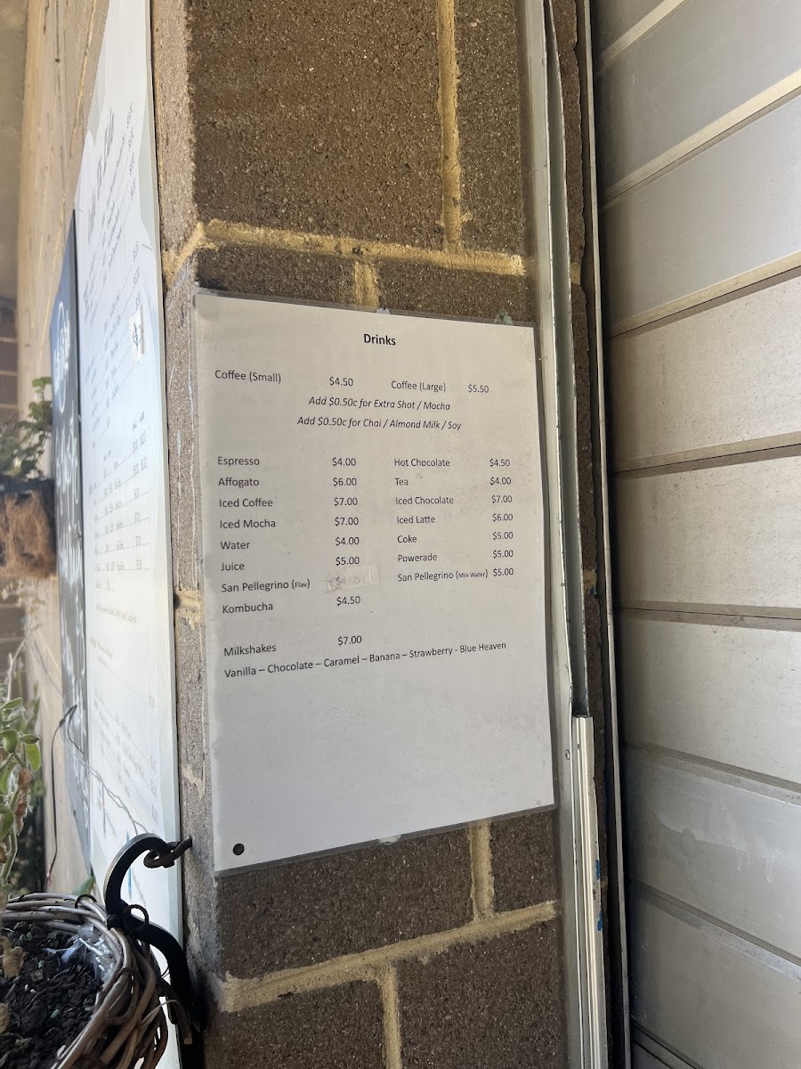 The menu is designed for quick ordering and casual dining, accommodating visitors seeking fresh food and coffee in a convenient setting near the beach. Additionally, there are specialty options such as puppy chinos for dogs.