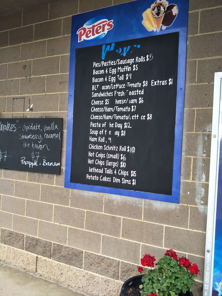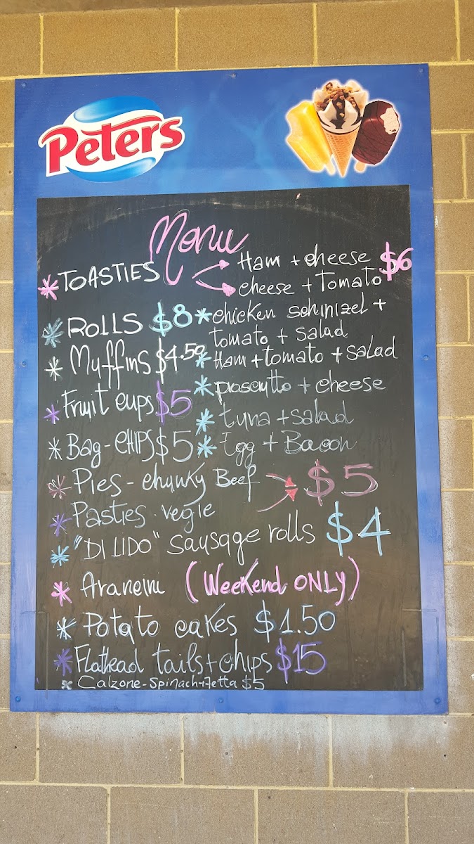 - Lunch and Savoury Dishes: Features options like lasagne, Italian green salad, pasta of the day, soup of the day, hot chips, potato cakes, dim sims, and flathead tails with chips.